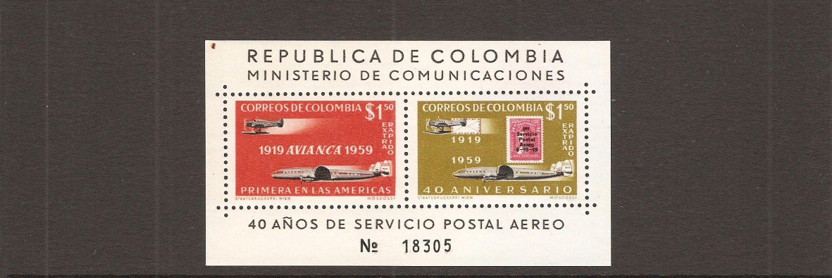 Colombia 1959 - 40th Anniv of Colombian "AVIANCA" Air Mail Services ms, inscribed "Extra Rapido"